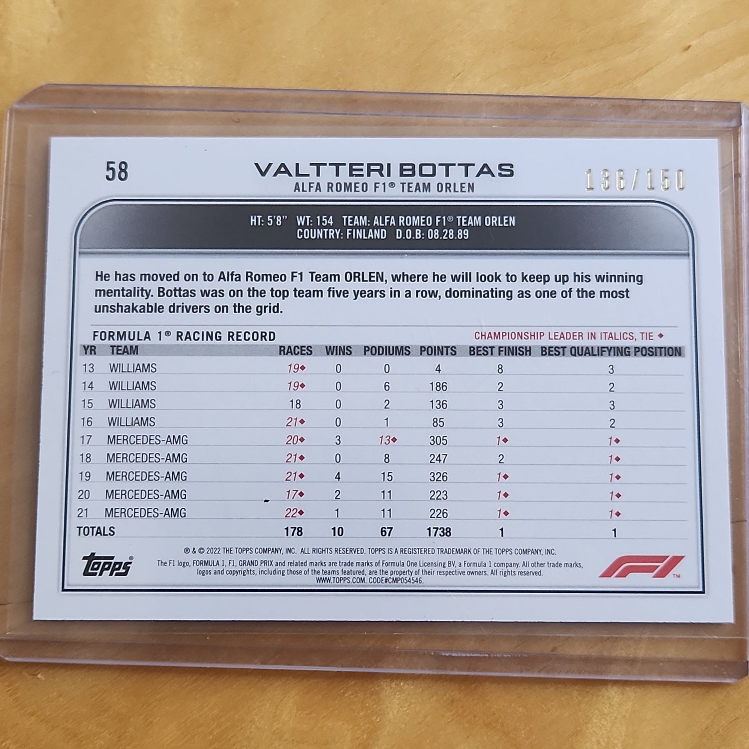 2022 Topps F1 Valtteri Bottas Pink 136/150 #181 Alfa Romeo F1 Team Orlen