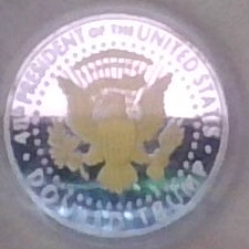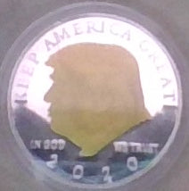 A coin with a picture of Donald Trump saying "keeping America Great" and "Trump 2020" The back has A Golden Eagle and a Blue ring around it that says "Seal of the President of the United States" A patriotic Item to have in possession, and a nice collectible.