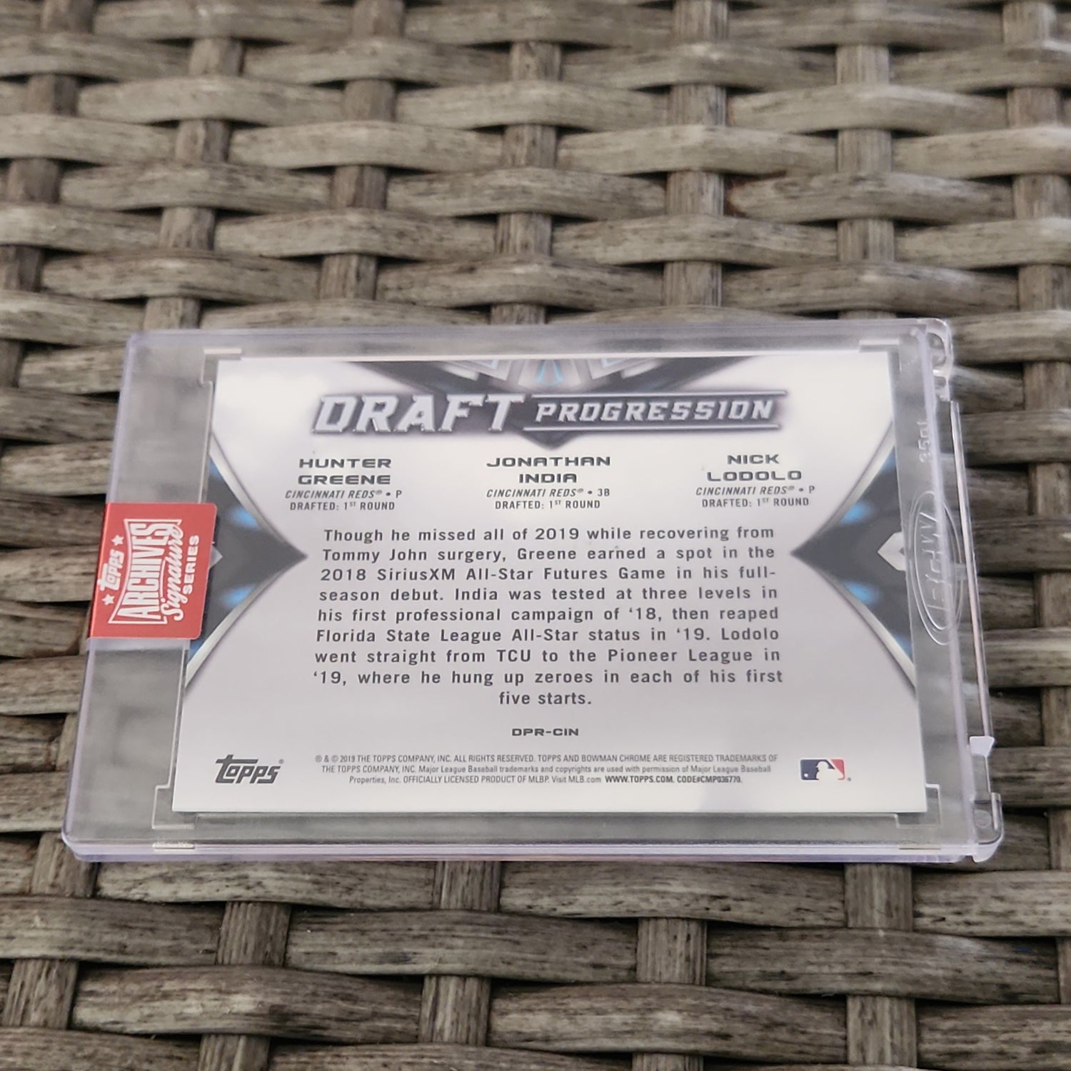 Topps Chrome Archive Signature Series 1st Bowman Draft Progression Hunter Greene, Jonathan India, Nick Lodolo Auto 10/17 #DPR-CIN
