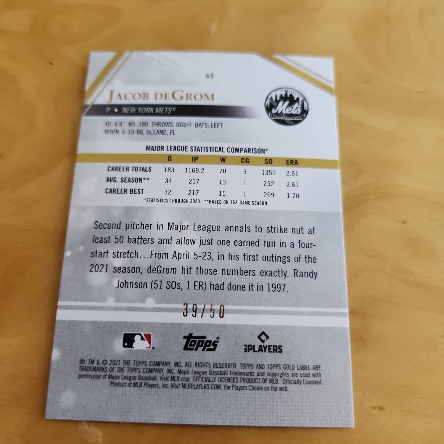 Topps Gold Label Red Jacob DeGrom 39/50 #63